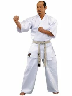 Original japanischer Vollkontaktschnitt mit betont kurzen Ärmeln und normaler Hosenbeinlänge. Die Hose mit Elastikbund hat eine zusätzliche Schnürung. Lieferung inklusive weißem Gürtel.