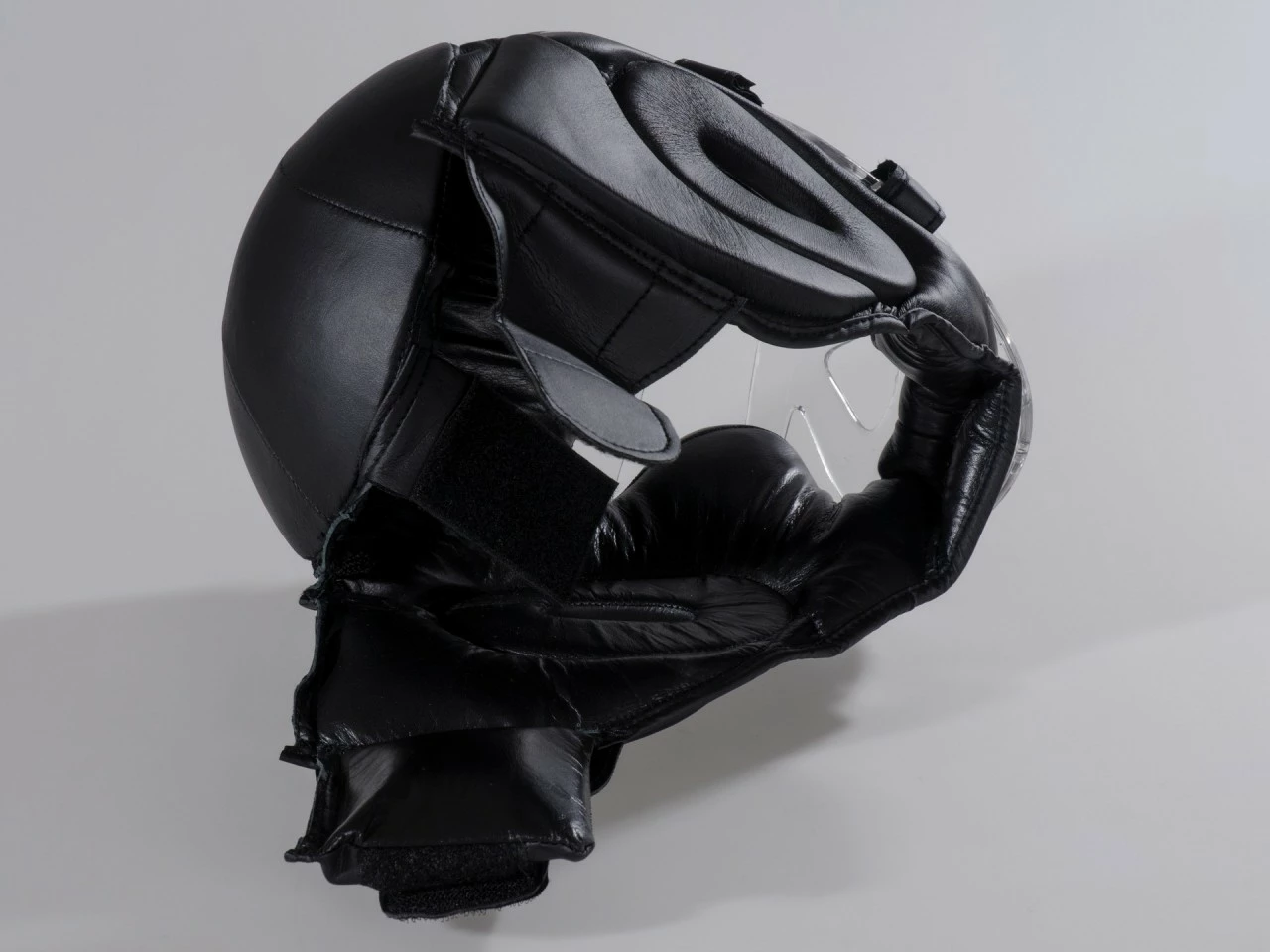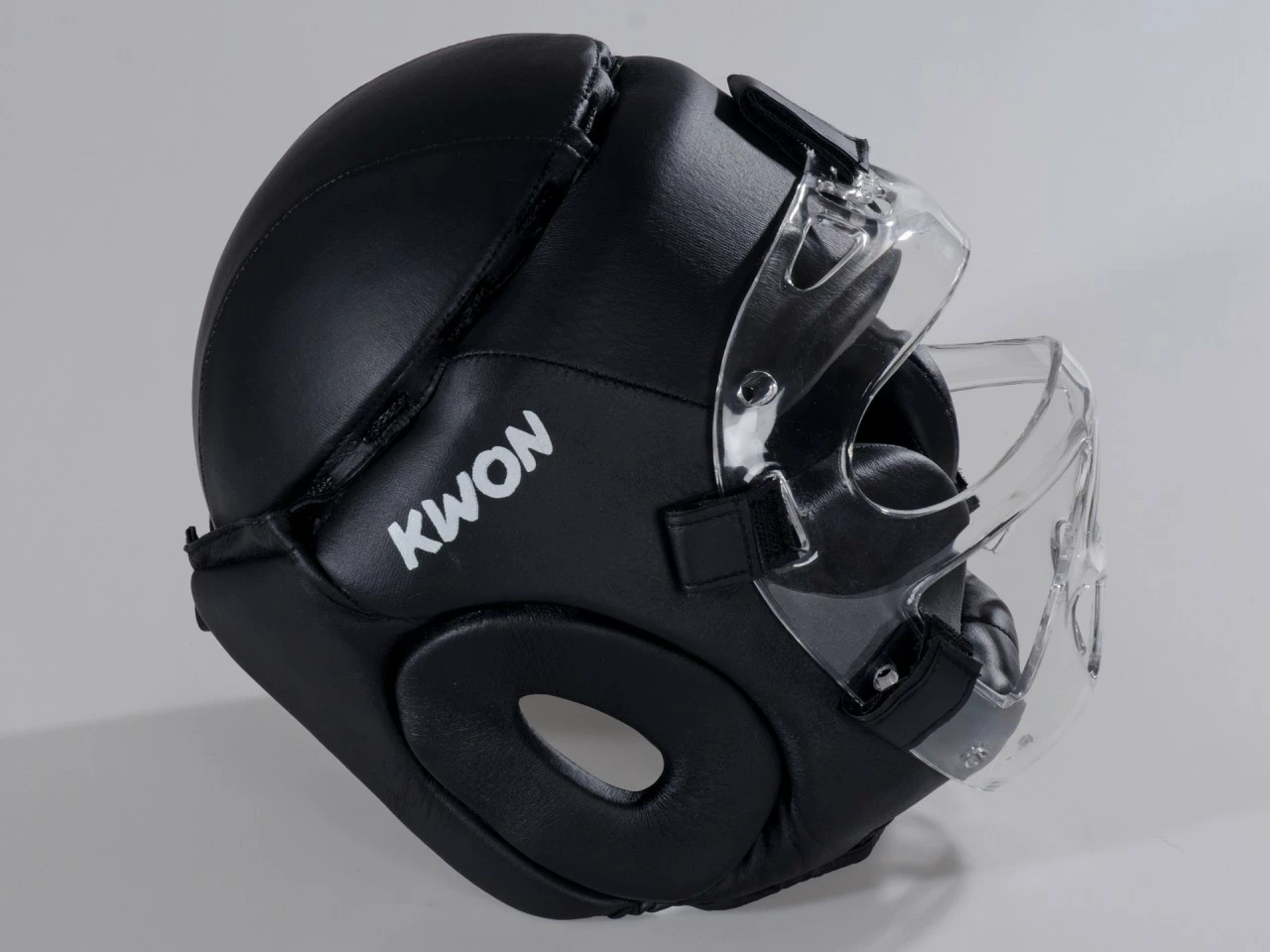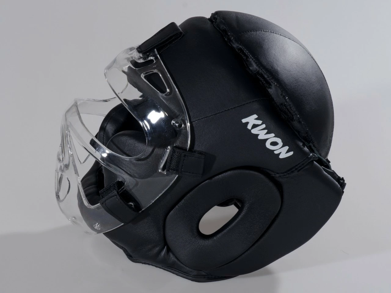 Der Kopfschützer besitzt einen Schädeldecken- und Ohrenschutz. Eine Plastikschale mit Schaumstoffeinlage dient als Schutz für die Schädeldecke. Das Gesichtsgitter wird mit Klettverschlüssen befestigt.