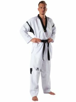 Der hochwertige Dobok mit schwarzen Mesh-Einsätzen an Oberteil und Hose ist von der World Taekwondo (WT) offiziell als Wettkampf-Anzug zugelassen.