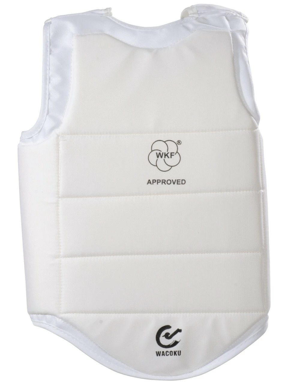 WKF Karate Weste WACOKU hat eine Oberfläche aus Polyester, das Rückenteil aus elastischem Stoff kann mit Klettverschluss optimal angepasst werden. Leicht und bequem unter dem Karateanzug zu tragen, mit WKF Zulassung.