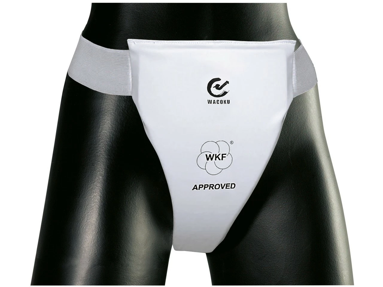 Der WKF Damen Tiefschutz hat innen eine Hartplastikeinlage und ist außen mit Kunstleder überzogen. Er wird von einem Stretchband gehalten.